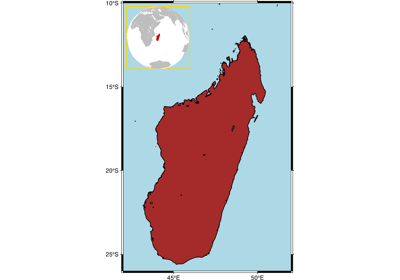 >>> import pygmt >>> from pygmt.params import Box, Position >>> >>> # Create the larger figure >>> fig = pygmt.Figure() >>> fig.coast(region="MG+r2", water="lightblue", shorelines="thin") >>> # Use a "with" statement to initialize the inset context manager >>> # Setting the position to Top Left and a width of 3.5 centimeters >>> with fig.inset(position="jTL+w3.5c+o0.2c", clearance=0, box=Box(pen="green")): ... # Map elements under the "with" statement are plotted in the inset ... fig.coast( ... region="g", ... projection="G47/-20/?", ... land="gray", ... water="white", ... dcw="MG+gred", ... ) ... >>> # Map elements outside the "with" statement are plotted in the main figure >>> fig.logo(position=Position("BR", offset=0.2), width="3c") >>> fig.show()